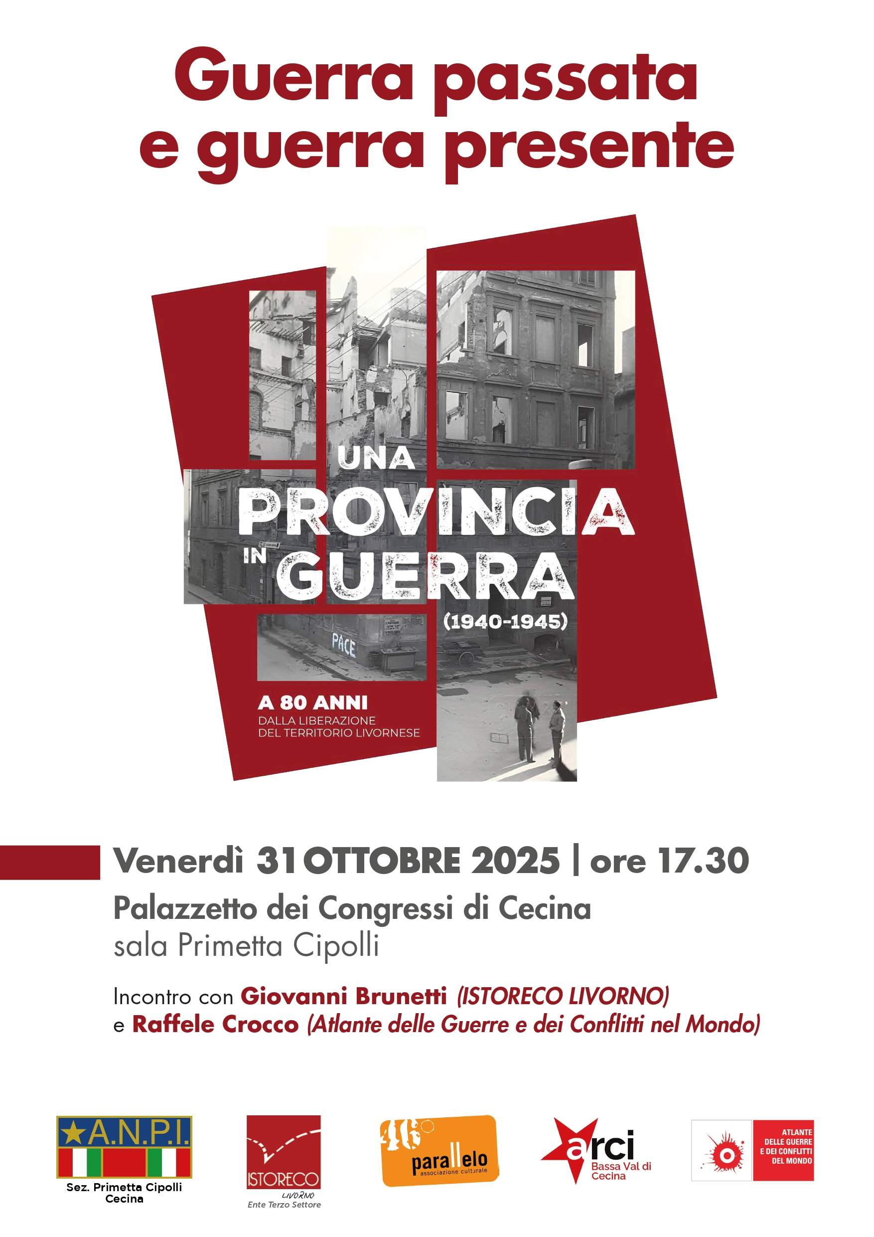 Nell'ambito della mostra "Una Provincia in guerra", promossa dall’Istituto Storico della Resistenza e della Società Contemporanea nella provincia di Livorno per ripercorree le vicende della provincia di Livorno dal fascismo alla Liberazione, venerdì 31 ottobre alle ore 17.30 si terrà un incontro dal titolo "Guerra passata e Guerre presenti" con Giovanni Brunetti di Istoreco e Raffaele Crocco di "Atlante delle Guerre e dei conflitti nel Mondo" per stimolare la riflessione sui pericoli attuali di guerra , partendo dalla realtà delle tragedie passate.