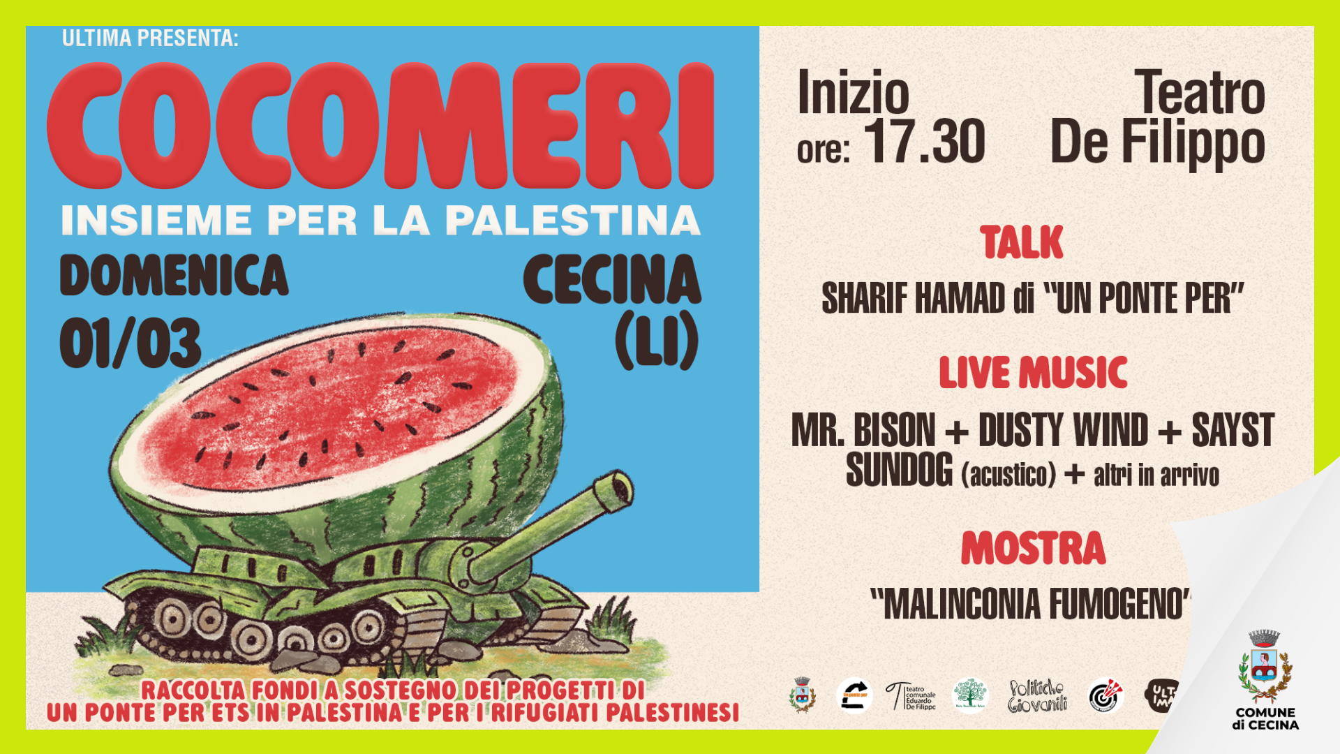 Evento organizzato in collaborazione con Comune di Cecina, Politiche Giovanili, Teatro Comunale De Filippo, Un Ponte Per, Rete Seminando Futuro e Giovani Fuoriklasse