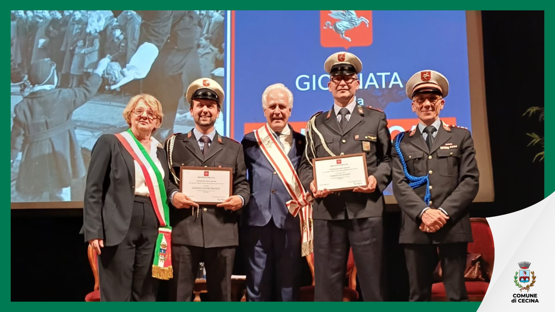 Nell'ambito della cerimonia sono stati premiati gli agenti della Polizia Municipale di Cecina Davide Franchi e l’assistente scelto Marco Venturini che hanno ricevuto un encomio per il salvataggio di un uomo e del suo cane dal sottopasso allagato in occasione dell'alluvione a Cecina dello scorso autunno: l’uomo bloccato nell’auto era rimasto paralizzato dal freddo e dalla paura e i due agenti si sono immersi senza esitazioni nelle gelide acque per liberarlo e trarlo in salvo. Mentre l'agente Franchi ha proseguito da solo a porre in salvo l'uomo, Simoncini è tornato indietro per liberare anche il cane dell’anziano, riuscendo dopo un’iniziale diffidenza da parte dell’animale, prima a calmarlo e poi a portarlo al sicuro.