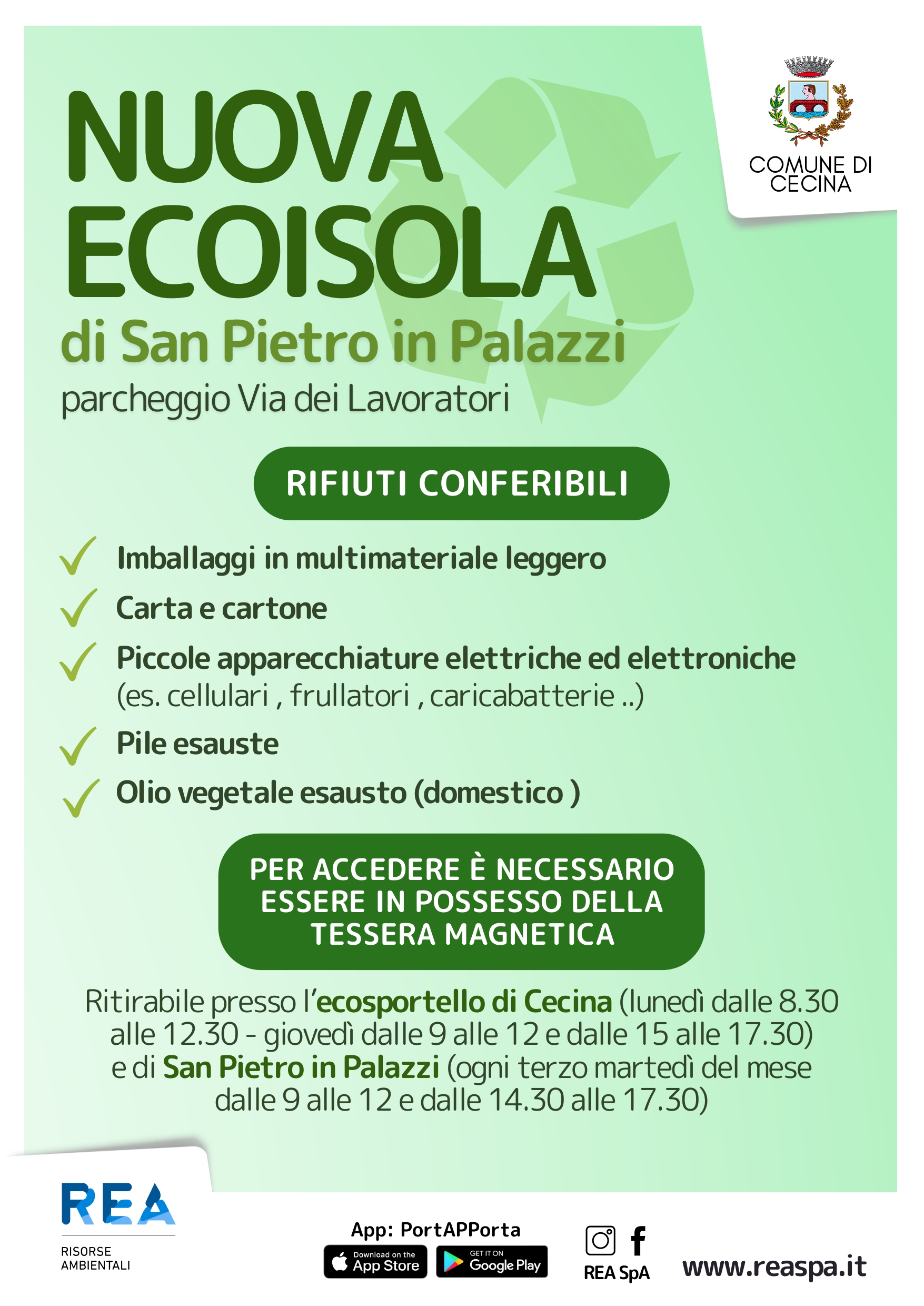 A San Pietro in Palazzi è attiva una nuova isola ecologica realizzata nel parcheggio di via dei Lavoratori, angolo via dell’Industria, in zona industriale. L’iniziativa è pensata per offrire ai cittadini un punto per il conferimento dei rifiuti comodo e vicino. L’accesso avviene tramite cancello automatizzato con tessera magnetica personale, che può essere ritirata gratuitamente da lunedì 21 luglio all’Ecosportello di Cecina aperto il lunedì dalle 8.30 alle 12.30 e il giovedì dalle 9.00 alle 12.00 e dalle 15.00 alle 17.30, oppure ogni terzo martedì del mese al Circolo ARCI di Palazzi dalle 9.00 alle 12.00 e dalle 14.30 alle 17.30.